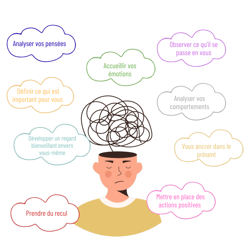L’objectif de cet accompagnement est donc de vous apprendre à vivre avec vos pensées, émotions et moments difficiles plutôt que de lutter contre.