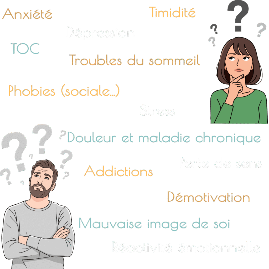 Elle permet d’analyser des pensées (« je suis nul », « je n’y arriverai jamais », « je ne suis pas sociable »…) et des comportements (s’isoler, fumer …), qui impactent votre quotidien et de les remplacer par d’autres, plus favorables à un bien-être durable.