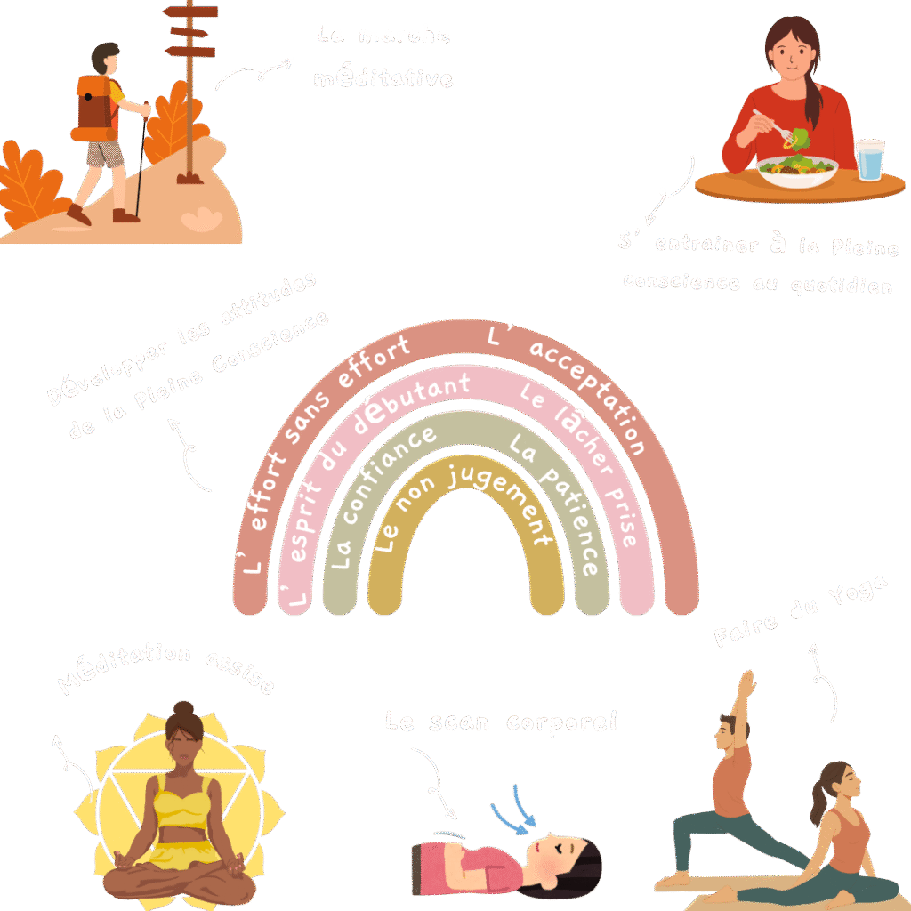 La formation au programme MBSR se réalise sur 8 semaines intensives, avec un instructeur certifié MBSR. Nous apprenons alors ce qu’est la Pleine Conscience, comment s’entrainer pour nous ancrer dans le présent, comment observer notre esprit avec différentes techniques (cf. image) et différents exercices (journal de bord). La formation se termine par une journée intensive de méditation en groupe, appelée « retraite méditative ».